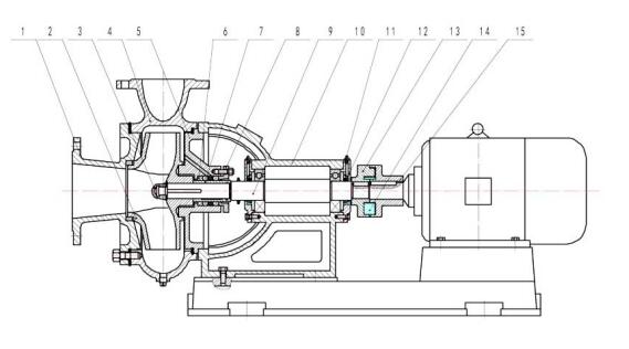 1、前泵蓋2、葉輪3、葉輪螺母4、泵體5、后泵蓋6、填料7、軸套8、填料壓蓋9、軸10、托架11、壓注式油杯12、軸承蓋13、泵聯(lián)器14、彈性塊15、電聯(lián)器